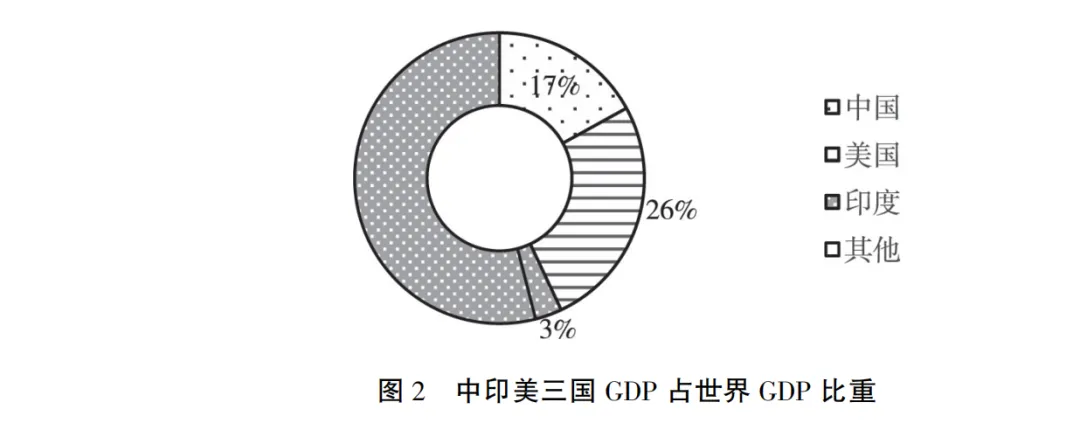 作為印度的比較對象,中國在經濟發展道路上的速度和總量是印度目前無法比擬的。與印度相比,中國經濟發展最大的優勢在於前期經濟增長速度的飛昇為後期財富佔比的擴大奠定了紮實基礎,在保證增速的同時實現了中國在全球財富佔比的持續且實質性上升。全球財富佔比的提高改變了中國在全球經濟格局中的地位,深度影響了全球經濟格局和國際關係格局。雖然中國作為第二大經濟體與美國經濟總量的差值仍然很大,但中國與其國內生產總值排名之後的國家之間的差距也非常顯著。因此,當下的國際經濟格局已經形成了“三區間兩斷層”的中美兩強之勢。在質差存在的情況下,每個斷層之後的段內排名競逐實際上並不具有重大意義。