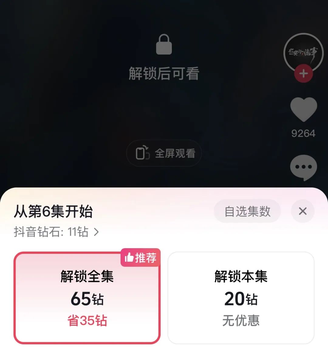 《興安嶺詭事》考慮了付費模式與用户觀賞習慣,率先吃上付費蛋糕。在集數與時長上,目前的AI短劇通常在10集以下,時長3-5分鐘。據其他媒體報道,《興安嶺詭事》最初設定5集,每集3分鐘。為了支撐付費短劇的體量,5集被拆成了11集,每集平均1-2分鐘。在抖音原生端上線後,前5集免費可看,若解鎖後6集則需付費65抖音鑽石。為了吸引用户付費,抖音還推出限時優惠半價,最終價格僅約5元人民幣。