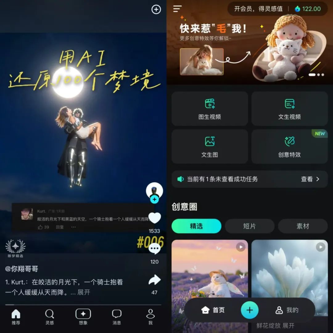 即夢AI在創作者生態上更勝一籌。從APP界面上看,即夢AI就像AIGC版抖音,底部菜單欄裏的“推薦”、“靈感”兩個板塊能瀏覽創作者作品並互動,“想象”則提供了AI生成工具,有圖片生成、視頻生成等多種玩法,創作完即可發佈。而可靈AI目前的界面更強調創作工具性,用户無法評論其他用户創作的內容,用户間也無法互動。