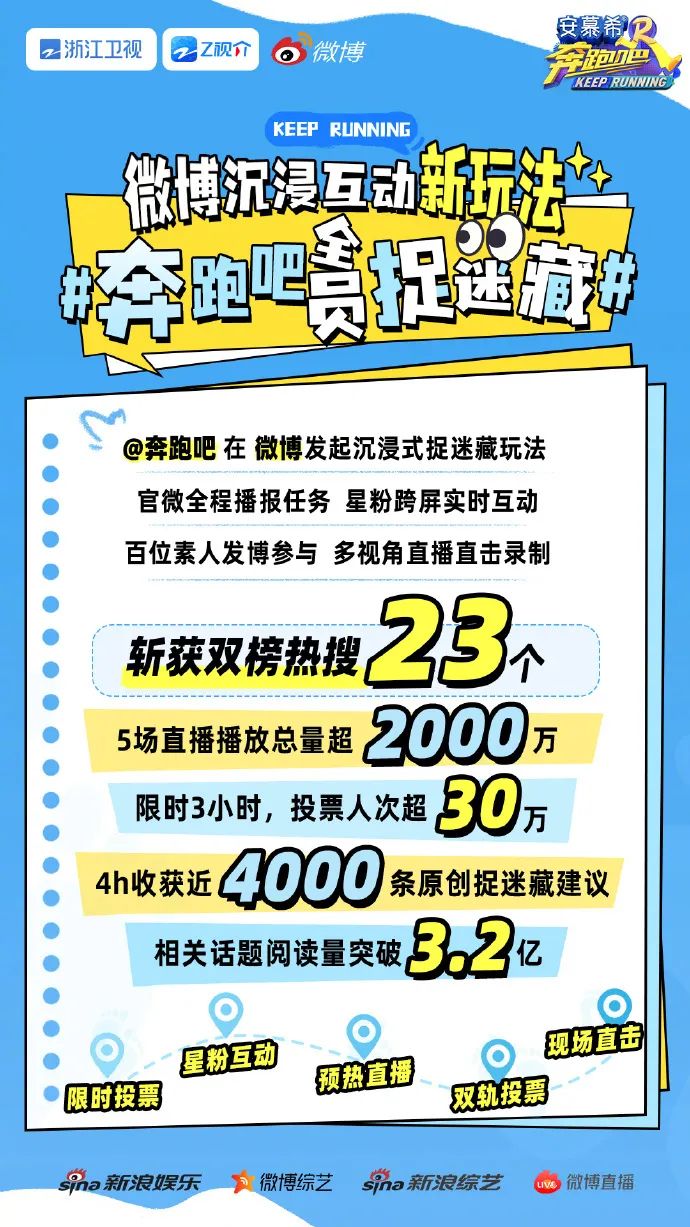 綜藝營銷則有一套“強互動、多元化”的營銷方法論貫穿始終。蓄水期藉助互動宣發為營銷招商注入活力,如《乘風2024》開啓“全民舉薦“模式,“姐姐們”未播先火;熱播期通過創新互動與聯動破圈引爆熱度,《奔跑吧12》在微博發起沉浸式捉迷藏玩法,多視角直播直擊錄製,打造“直播+社交”的標杆性互動案例;播出後憑藉熱評熱議傳遞節目價值主張,《再見愛人4》衍生社會議題全民探討,挖掘節目深度打造節目口碑。