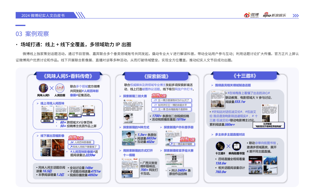 紀實人文節目領域,微博打破場域壁壘,多元策劃推動節目出圈。《風味人間5·香料傳奇》與人民日報等多個領域的官方微博共同發起#人間百味影像展#徵集活動,60多位跨領域大V共同分享百味美食,線下展出百幅影像,助推話題總閲讀量躍升至2239w。