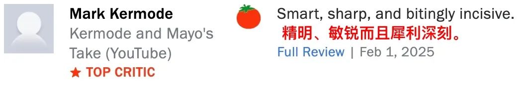 爛番茄媒體新鮮度高達94%(231家媒體),觀眾評分也高達89%(1000+認證用户),難得媒體和觀眾同時一致給出好評。