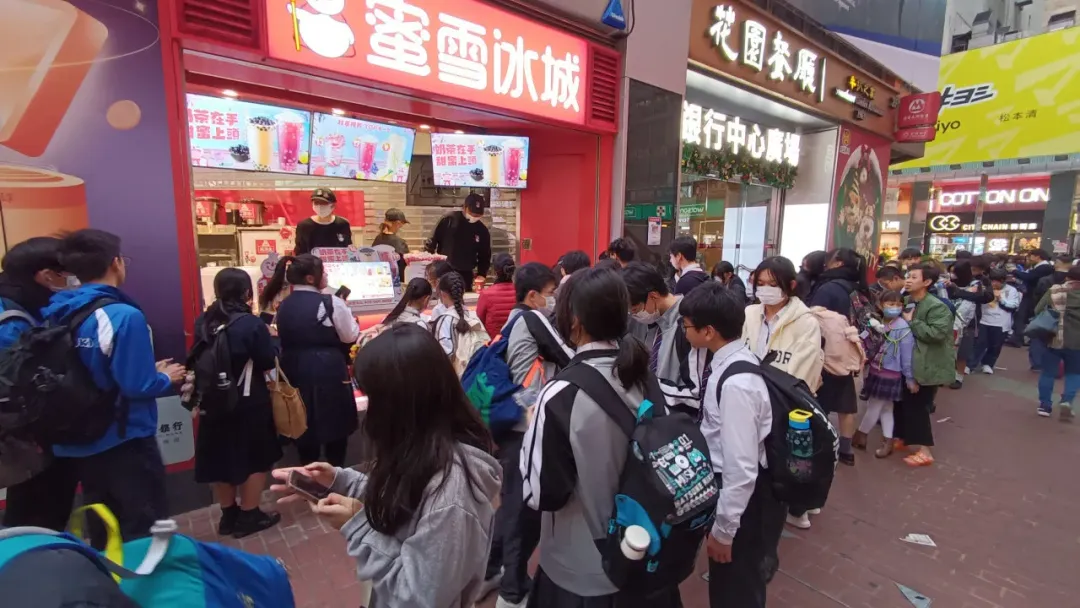 圖:蜜雪冰城旺角分店門口排起了長隊,又便宜又甜的奶茶,自然是學生的最愛