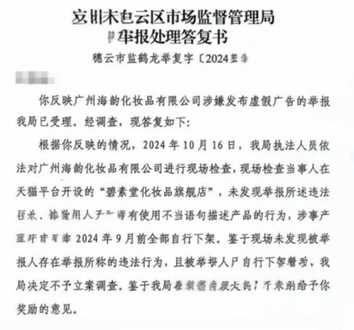 從相關行政處罰決定書來看,廣州市白雲區市場監督管理局對廣州海韻化妝品有限公司進行了現場檢查。當事人承認曾使用不當語句描述產品,並且涉事產品鏈接已於 2024 年 9 月前全部自行下架。但令人遺憾的是,監管部門並未明確指出究竟哪些宣傳屬於違法行為,也沒有對其進行立案處理。