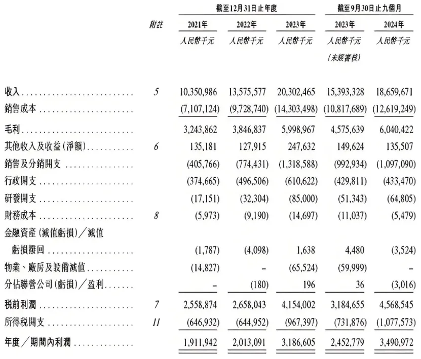 再看今年年初上市的蜜雪冰城。根據財報顯示,從2022年到2024年前九個月,它的收入分別為136億、203億、187億,同比分別增長31.2%、49.6%和21.2%。