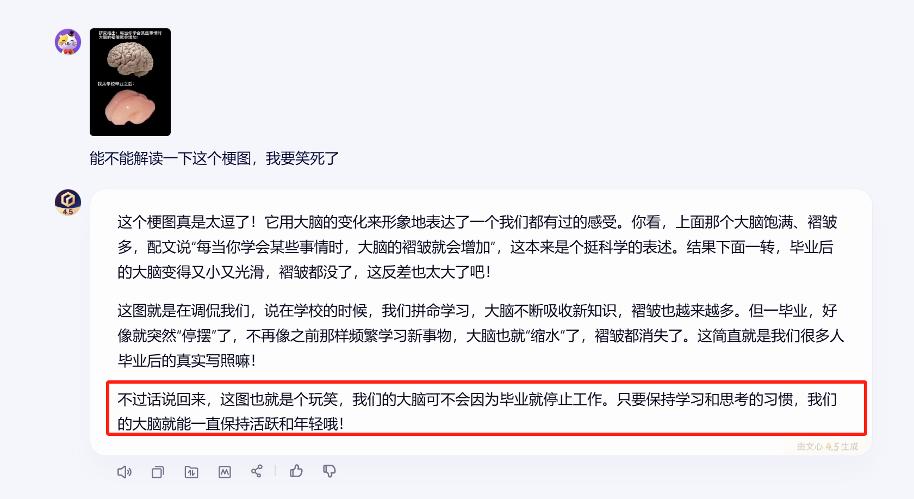例如我讓它幫我解讀一幅梗圖,它解讀完還“高情商”地鼓勵我工作了也得繼續學習: