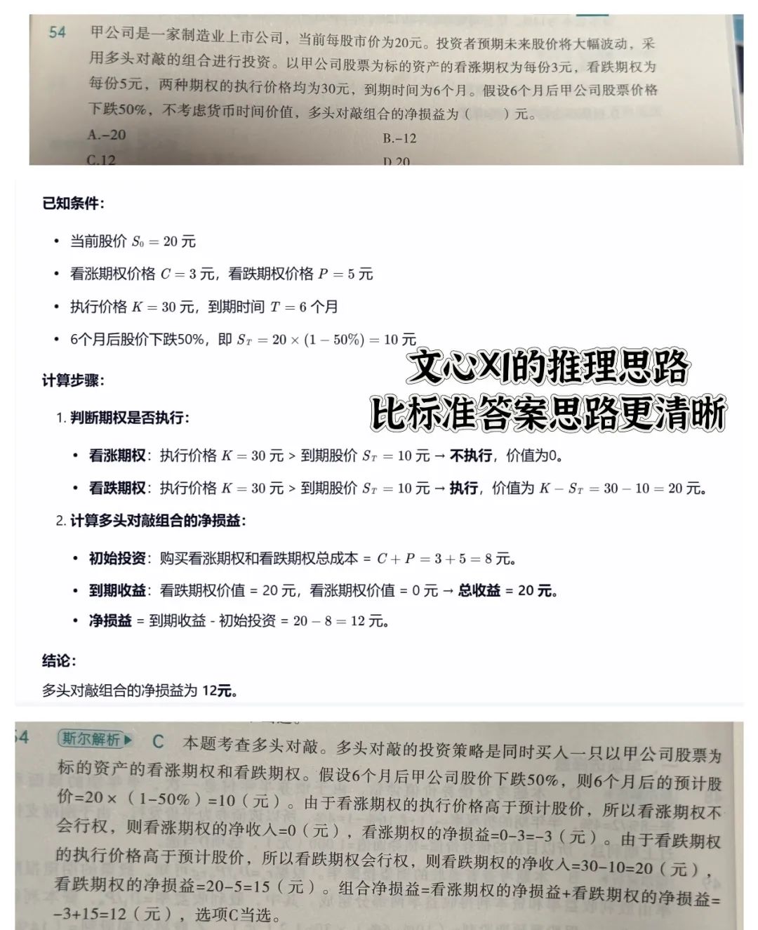 文心大模型X1用了比標準答案更明晰的方法去推理,並且解出來了財務知識疊加運算的問題。