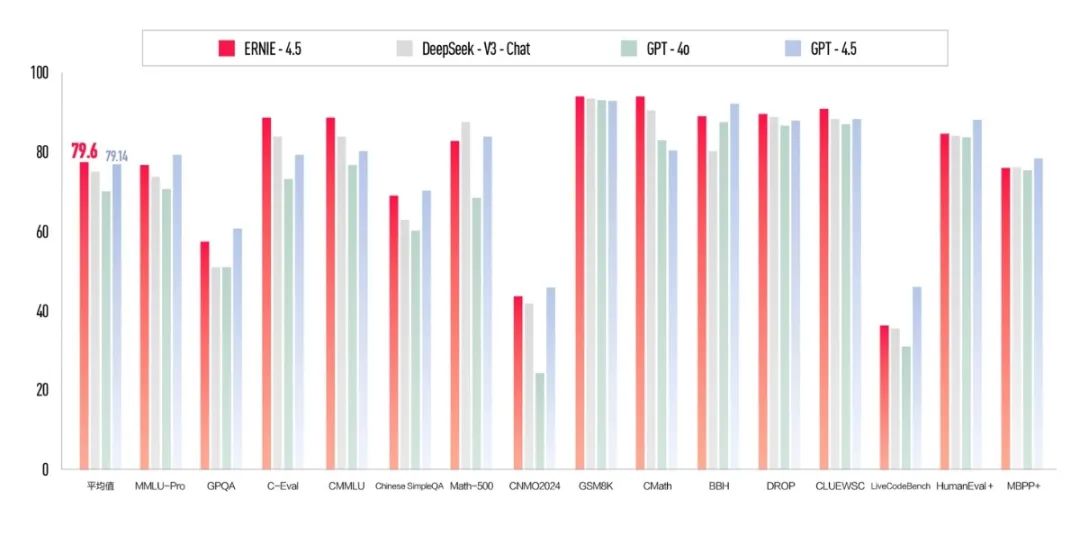 另外,百度還上新了文心大模型4.5,作為百度新一代基座大模型,文心大模型4.5的多項基準測試成績優於GPT4.5、DeepSeek-V3等,並在平均分上以79.6分高於GPT4.5的79.14。