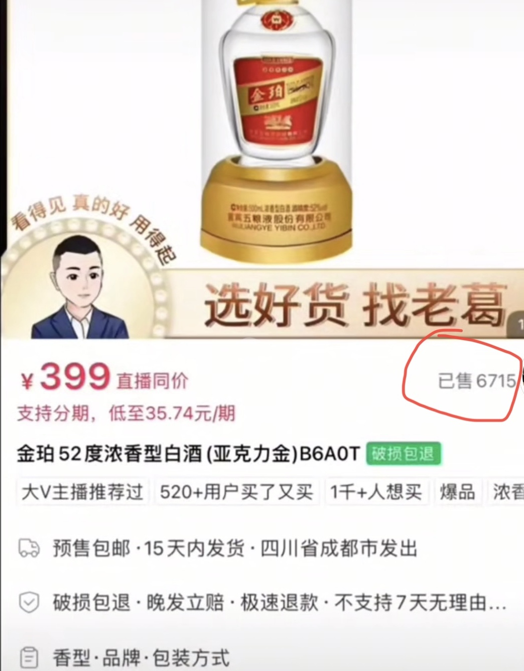根據網友的錄頻顯示,在一次直播帶一款五糧液股份白酒的時候,老葛和品牌方現場演繹“砍價”劇本後,“破價”上鍊接,一瓶白酒的單價為399元,並聲稱下線都賣八九百。