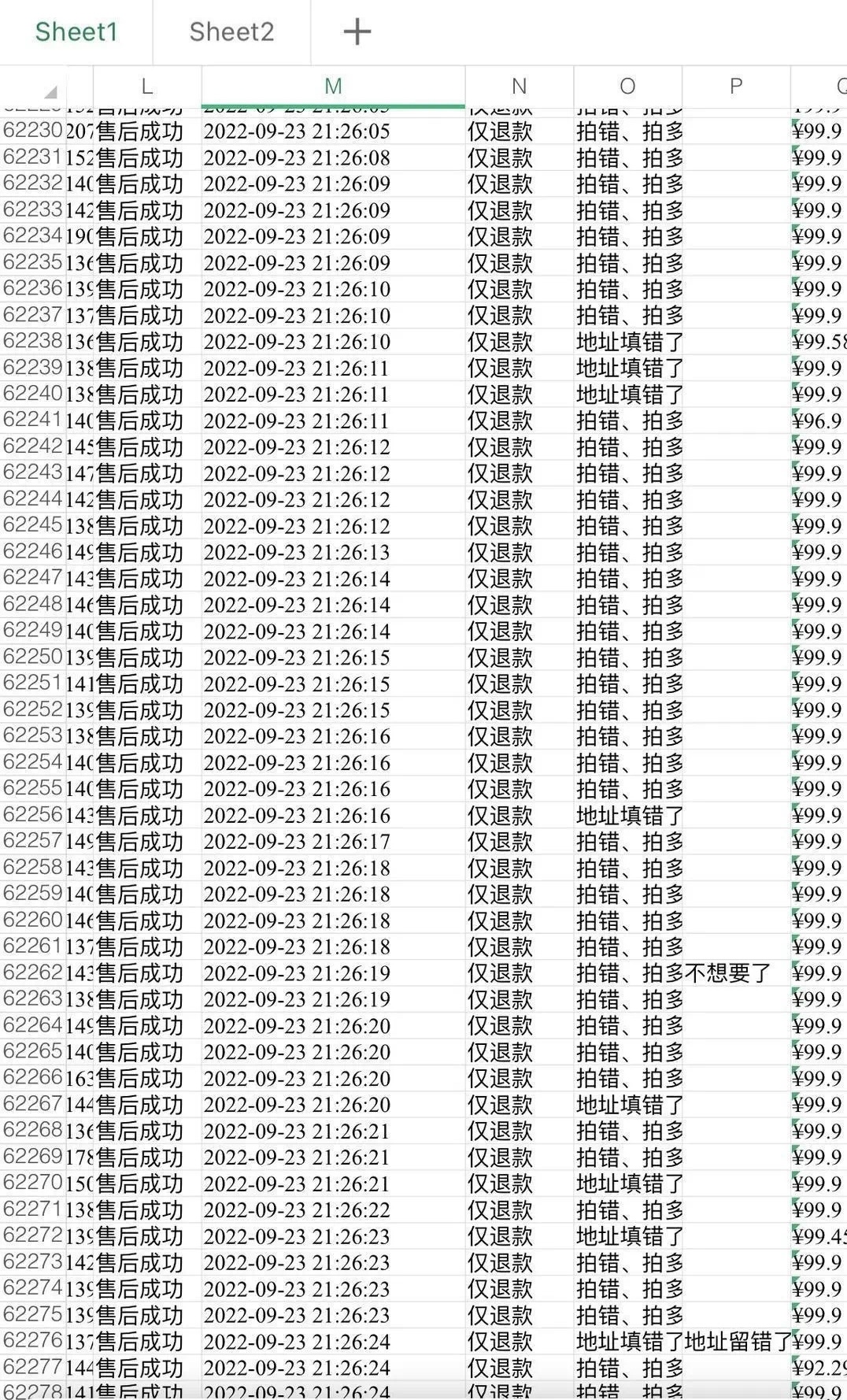 王翠仔細整理這些退款訂單又發現,很多賬號為同一賬號,下單數據高度接近。某一賬號在2022年9月23日直播中,先後4次下單,每單數量99件,衣服的尺寸也都一致。幾場直播下來,單是這個賬號就下單9552單,總金額達到107萬。這些訂單有的沒有付款,有的付款後又退貨。