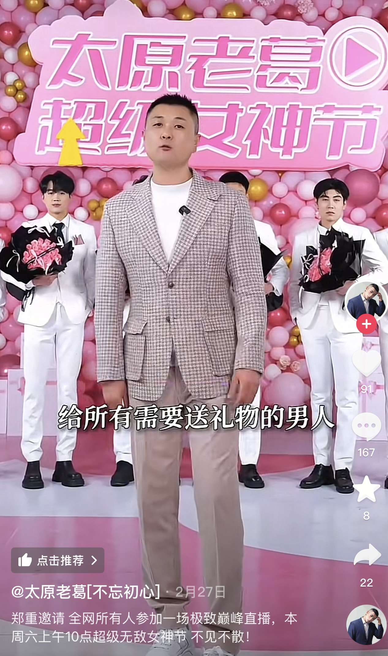 截至3月17日,太原老葛在快手上的粉絲已經達到9271萬,接近1個億。可能是受到刷單事件影響,太原老葛最新一期視頻發佈於2月27日,視頻是為3月1日超級女神節直播專場做宣傳。但是,這場女神節的直播也沒有如期舉行。