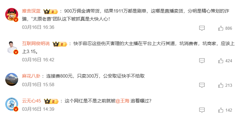 銷售額2811萬,1911萬是刷單,刷單都這麼不走心?去年,快手千萬粉絲網紅太原老葛被商家舉報,帶貨成交額大部分是刷單。近日,該事件終於有了進展,太原老葛團隊成員因涉嫌合同詐騙被刑拘。