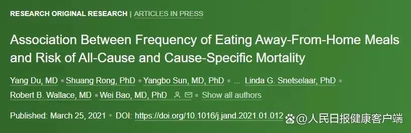 2021年武漢科技大學醫學院、愛荷華大學的研究人員在《營養與營養學學會雜誌》刊發的一篇研究發現,經常在外就餐/點外賣(每天≥2次)與全因死亡的風險增加顯著相關,全因死亡率高49%。