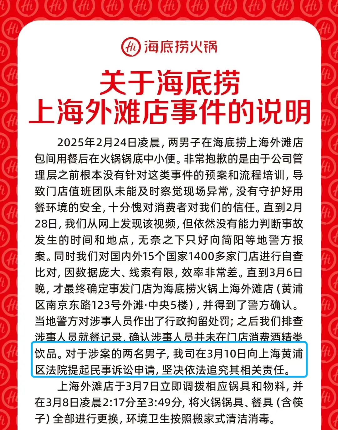 2025年2月24日凌晨,兩位男子在海底撈上海外灘店聚餐時,向火鍋內小便