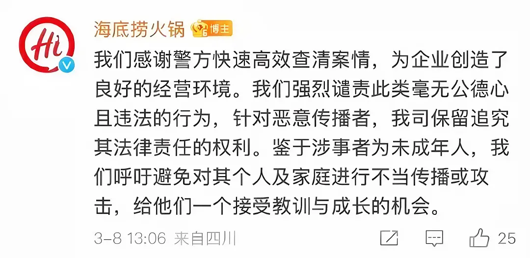 但事關未成年人,海底撈沒有第一時間錨定受害者的身份,而是針對始作俑者,採取了原諒的態度,表示要給他們一個接受教訓與成長的機會,並且還呼籲大家避免對其個人及家庭進行不當傳播或攻擊,並強調譴責並追究“惡意傳播者”的責任。