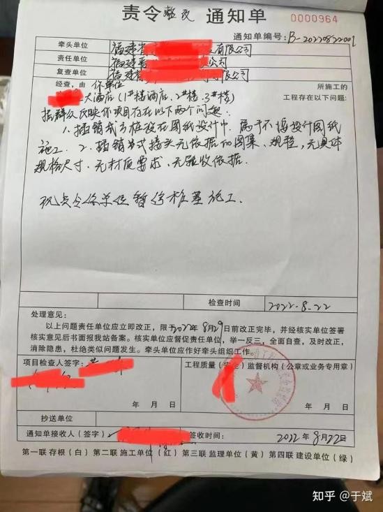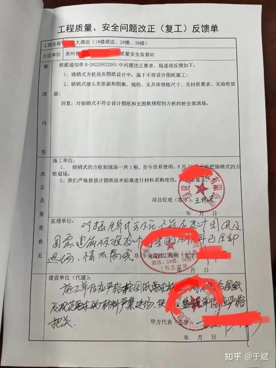 2022年8月,福建省泉州市某五星級大酒店施工中,相關方未按照設計圖紙施工,擅自使用插銷式方樁,被質監站、監理單位和建設單位核查發現、要求清場,整改通知單顯示,“插銷式接頭無依據和圖集、規程,無具體規格尺寸、無材質要求、無驗收依據。”