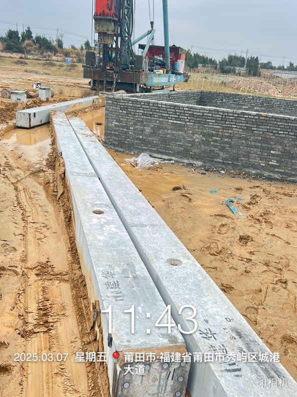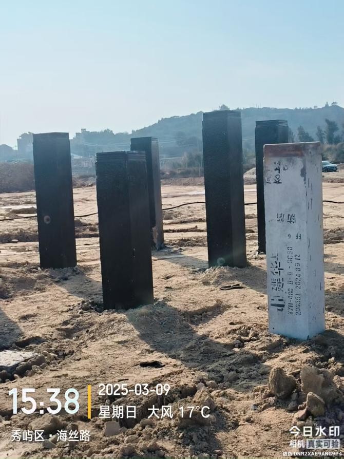 3月9日施工現場的一張照片顯示,6根植入地下的預製樁中,只有1根預製樁的樁身標識完整,標識為“建華”“YZH-400-B”字樣,其餘5根全身都被塗黑。