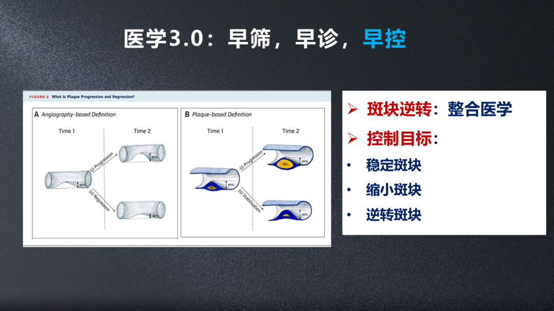 如果説我們有斑塊了,如果説我們需要康復怎麼辦,從醫學3.0時代來看,它是把人體作為一個獨特的個體,來進行整體化的個性化的干預。那它除了手術治療藥物以外,它更多的是依賴於什麼,我們的運動康復,依賴於我們的膳食營養,依賴於情緒睡眠,依賴於我們的傳統中醫,還有我們的抗炎,修復內皮,還有我們的生活方式。