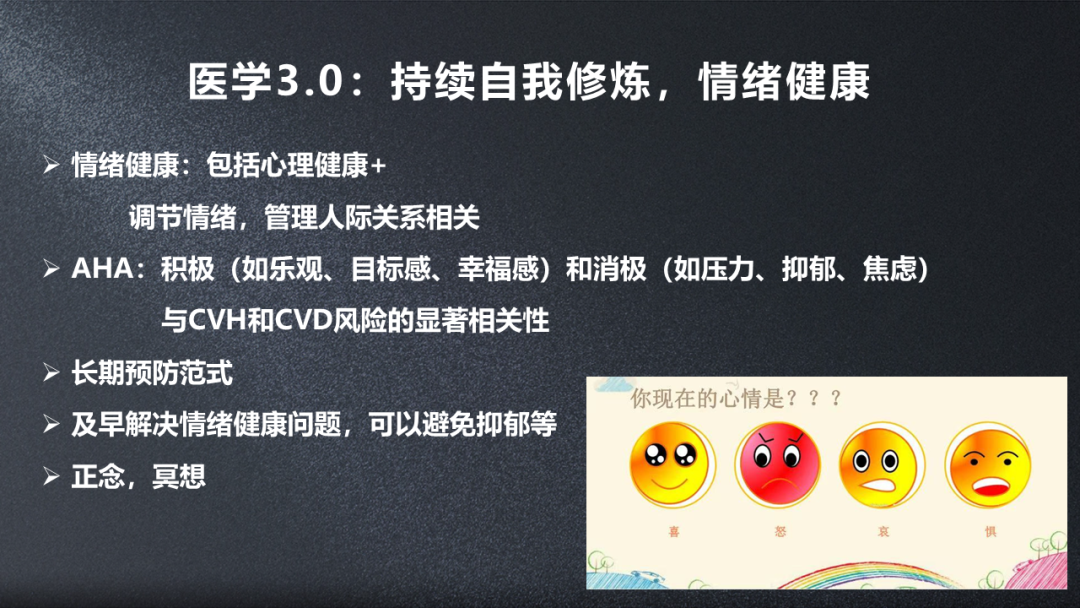 從美國的AHA(美國心臟協會)的結果來看,積極的和消極的情緒,它和我們的心血管健康,和冠心病的風險,是有非常顯著相關的作用的,所以説我希望我們,在座的各位,能夠真正的每天開心的工作,開心的生活,和家裏面和睦相處,我們真正獲得我們的心血管健康,這是非常有意義的,非常有價值的。