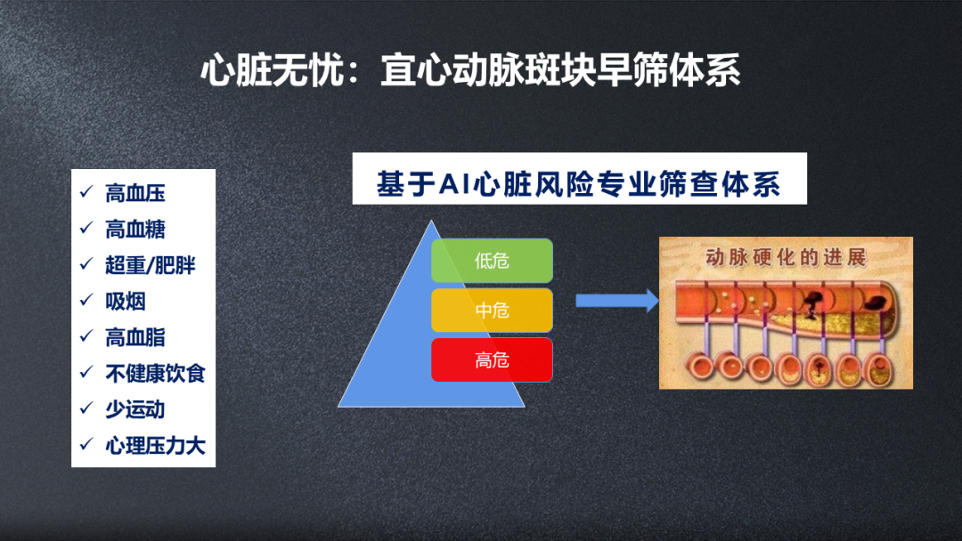當我們真的有風險的話,我們怎麼樣去早期發現,我們身體裏有沒有斑塊,那除了剛才我説的,我們心臟無憂的斑塊早篩體系以外,其實我們大家很多人都在體檢,但是每年的心臟病仍然非常多,為什麼?我們體檢順便看到你的冠脈鈣化,但是很多人對這個事情是不管不問的,當你發現冠脈鈣化的時候,其實是表明了你已經有斑塊了。