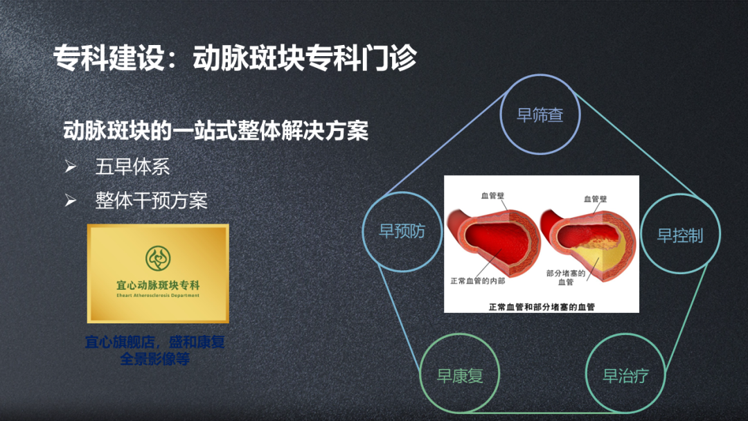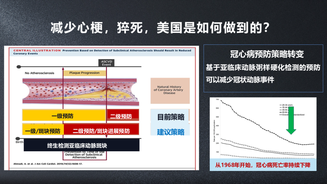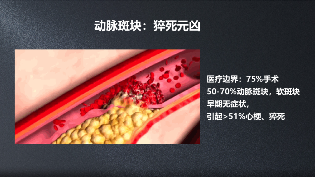 我們醫學的邊界是什麼,我們醫學的邊界是75%,就當我們的斑塊(血管狹窄)達到75%的時候,醫生才有權力給你做支架,做搭橋手術。但事實上來説從國際的研究進展來看,50%左右的斑塊,也就是早期的斑塊,尤其是軟斑塊,它引起了一半以上的心梗和猝死,而這一部分在我們臨牀,在我們平時的醫生裏邊是不關注的。不單是我們大家對斑塊認識不夠,我們的醫生其實認識也不夠的,不單是我們大家要改變這種理念,我們很多的醫生也要知道,我們怎麼樣去早期的去預防,去控制我們的斑塊,從這一點來説我認為是在未來裏面,是非常非常重要的一點,