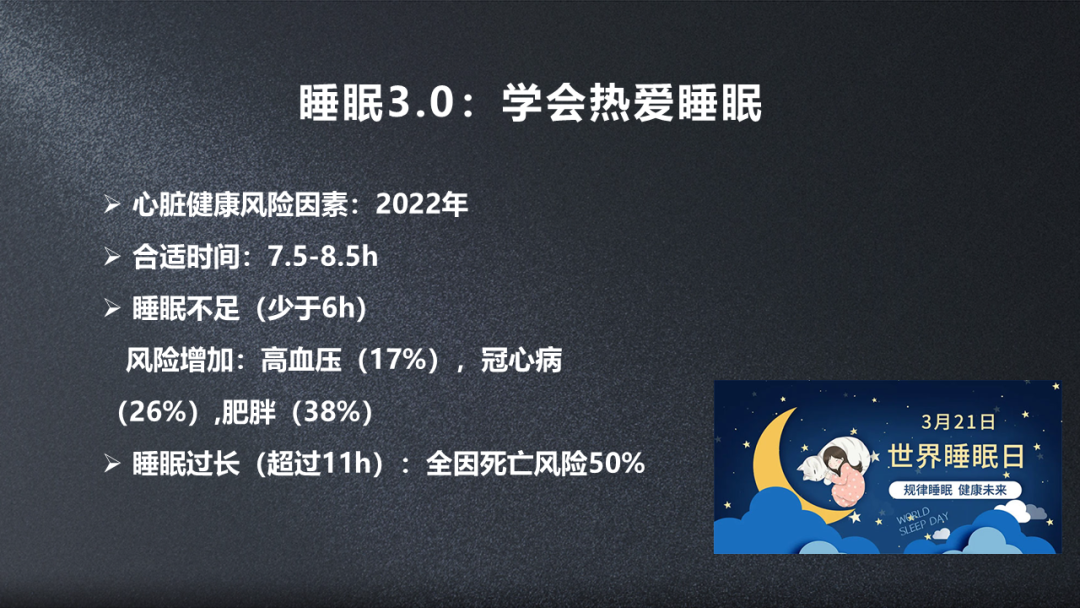 我想可能在座的很多的人,有被睡眠所困惑,但事實上只有到2022年,美國心臟病學會才把睡眠,納入到心臟健康裏邊去。原來它是對心臟健康有影響,但是沒有正式納入到,心臟健康的體系裏面來。