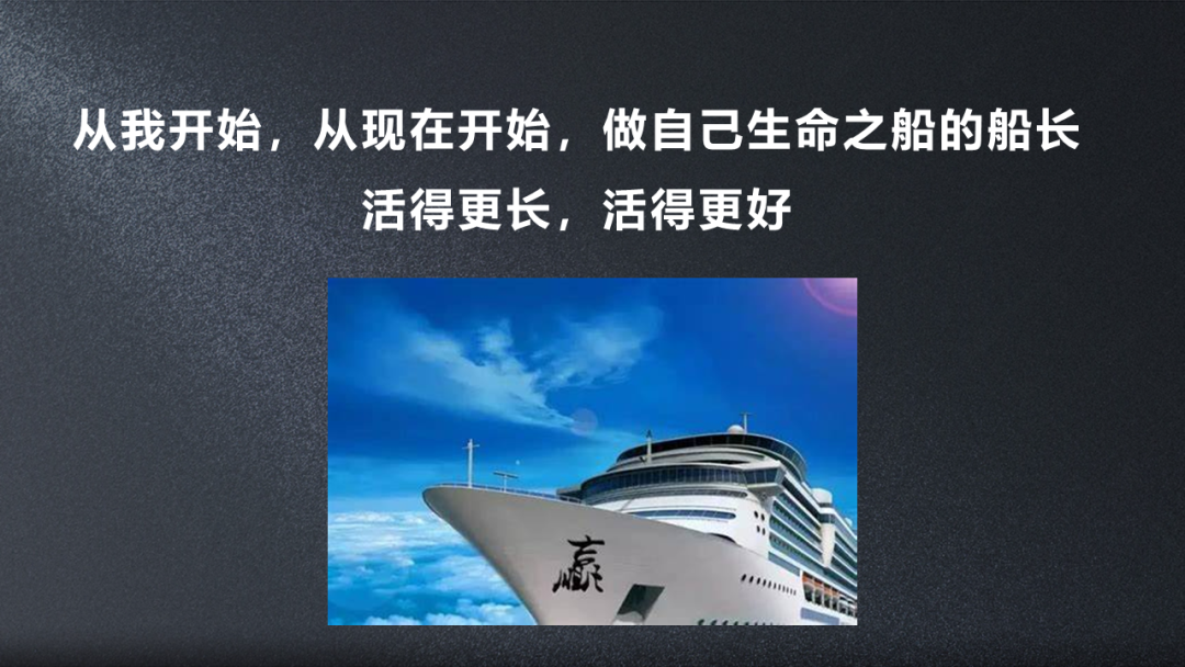 因為時間關係,我重點分享這些內容。最後我想有句話和大家來共勉,從我開始,從我們開始,從現在開始,做自己生命之船的船長,讓我們活得更長,活得更好,謝謝大家。