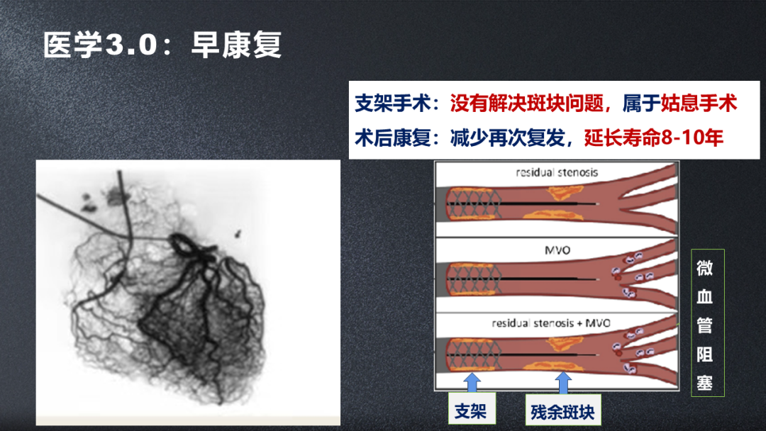 當然很多的人還有微血管病變,尤其是女性,很多女性,她胸悶異常,但心臟是好的?為什麼,因為它有微血管的病變,這些病變單純靠吃藥行嗎,不夠的,所以説我們一定要做心臟康復,才能解決我們的風險的問題,才能解決我們的斑塊的問題,才能讓我們未來少發生再次狹窄,再次心梗,再次住院。