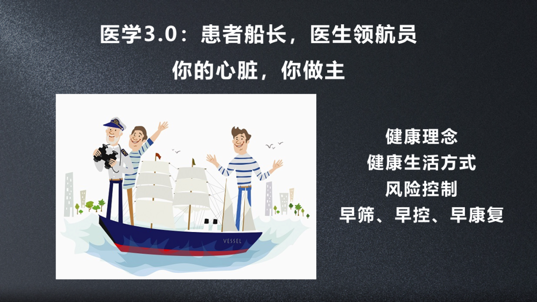 在3.0時代,我們的患者或者我們的個人,原來是作為一個乘客,我們自己要做船長,那我醫生做什麼呢?醫生是作為領航員,他會指導你能夠避免碰到冰山,在冰山的區域裏邊能夠越過去,能夠保持一種比較好的,一種穩步的向前的遠航。