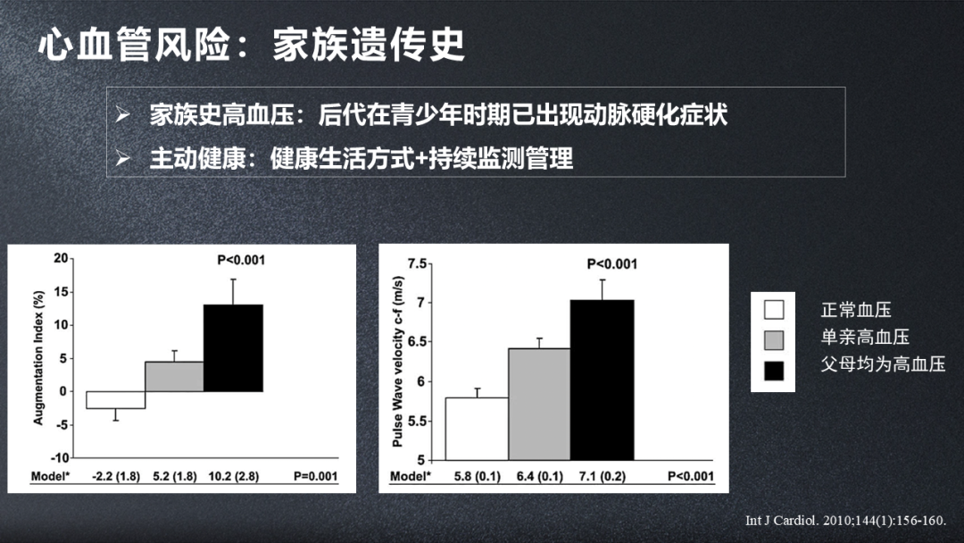 我今天重點講我們的家族史,可能我們很少人去關注家族史。那麼假如説自己的父母雙方有高血壓的話,你的子女發生高血壓的幾率和冠心病幾率,風險是大大增加的,也就是説假如我們的父母有高血壓,我們自己也有高血壓,那我們的未來的孩子,那麼在年輕的時候,就可能發生了動脈硬化。即便是這時候他還沒有高血壓,一般是在他高血壓發生十年之前,他的血管開始發生了問題。
