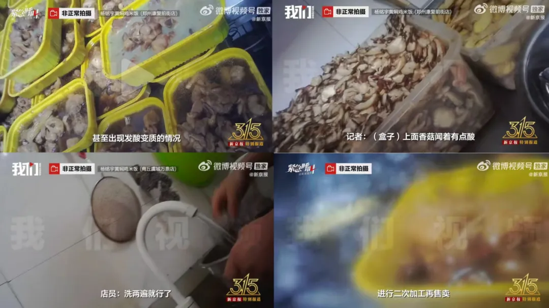 使用存放多天的發酸食材,顧客食用後的剩菜回收再加工售賣,隔夜發黑的牛肉加色素後冒充新鮮牛肉……當記者暗訪鏡頭掃過多家楊銘宇黃燜雞米飯加盟店後廚,屏幕前“打工人”集體破防:原來每天點的外賣,竟是如此令人觸目驚心的大亂燉。