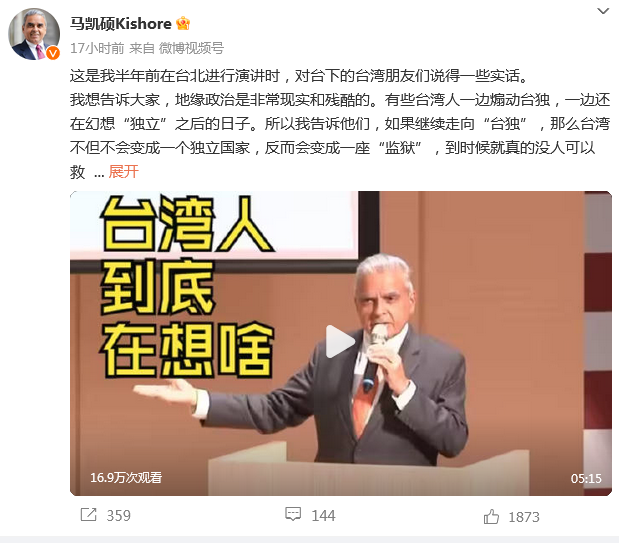 3月17日,新加坡國立大學傑出研究員@馬凱碩Kishore 在社交平台上分享了一段視頻,稱“這是我半年前在台北進行演講時,對台下的台灣朋友們説得一些實話”。