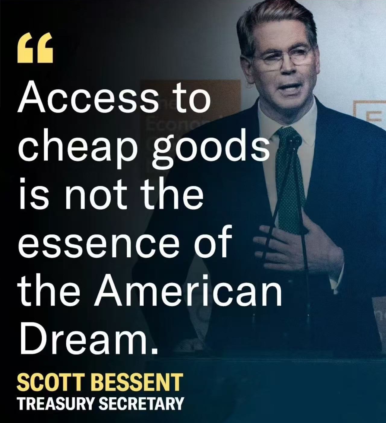 最近有些很有意思的新聞,有許多是關於所謂“海湖山莊協議”的。這裏面的説法很多,按照花公子的看法是,目前大家都看不懂特朗普執政的邏輯,尤其是財政方面。“海湖山莊協議”就是試圖解讀目前特朗普所下的一局,目前大家都看不懂的“大棋”。作為“海湖山莊協議”傳言的一部分,美國財長貝森特至少表達了一些他的有趣的看法,這裏他明確地指出許多美國所宣傳自由主義的經濟的理念,將會被改變,其中一條就是“美國夢”中,將不會有便宜的商品。