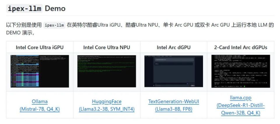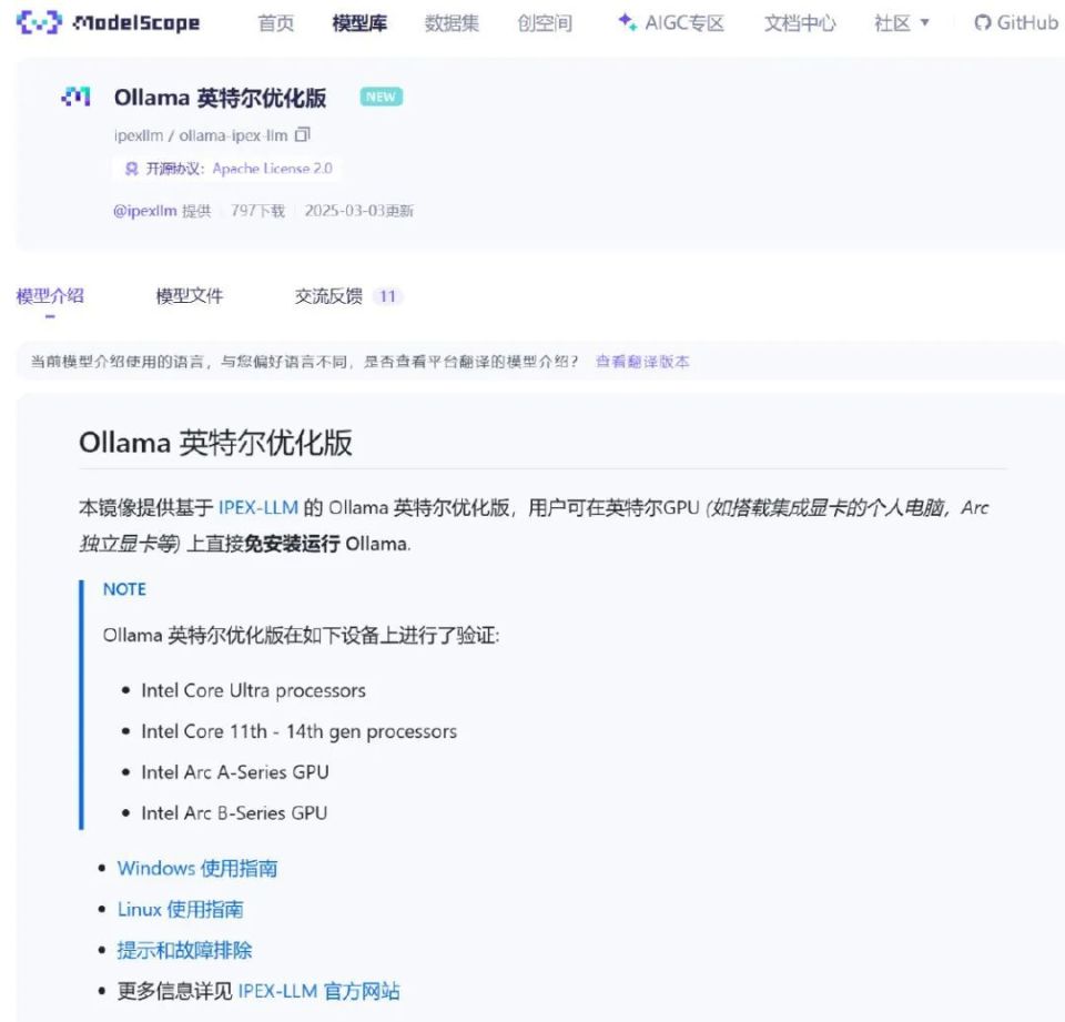 在魔搭社區ipexllm/ollama-ipex-llm就能看到專門的IPEX-LLM Ollama安裝頁面,這套基於IPEX-LLM的Ollama英特爾優化版已經針對11代到14代酷睿,酷睿Ultra系列,以及英特爾Arc A系列和B系列GPU優化。