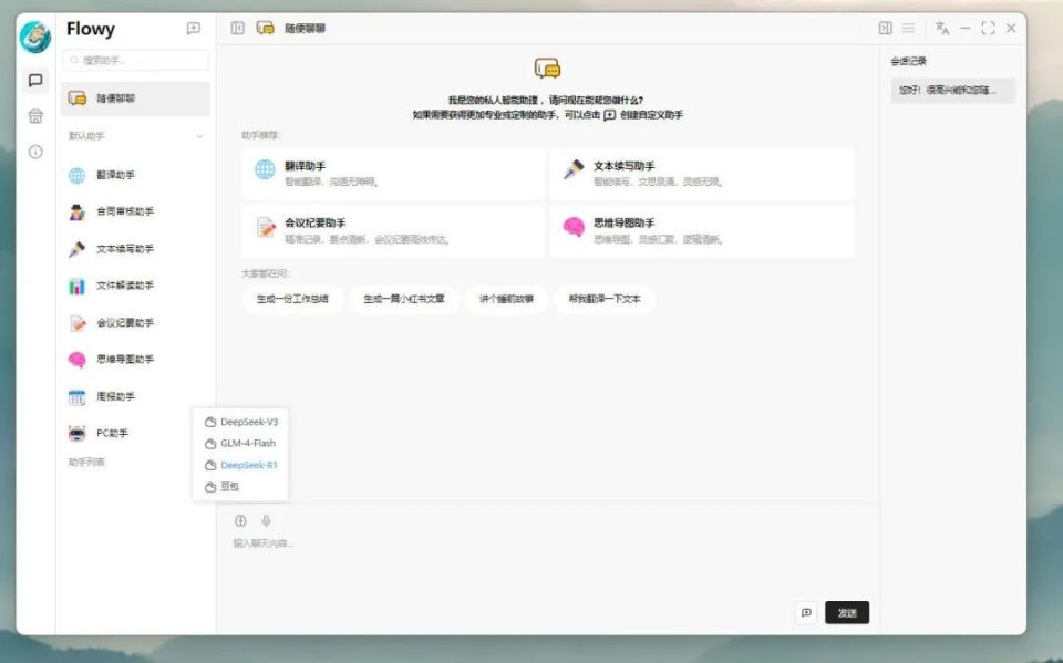 最新版的Flowy已經集成DeepSeek-V3、DeepSeek-R1、GLM-4-Flash、豆包模型。