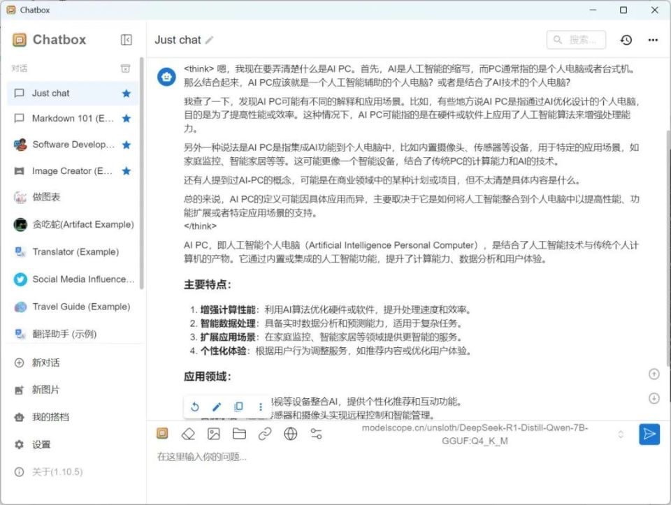 純文字界面當然還差點意思,後續我們還可以通過ChatBox AI客户端,或者Edge瀏覽器插件,安裝之後,客户端或者插件就會自動檢測到之前安裝的Ollama Serve,不需要更多的設置,就能獲得更直觀的交流界面,對話的方式也能幫助你獲得更多與DeepSeek交流的靈感。