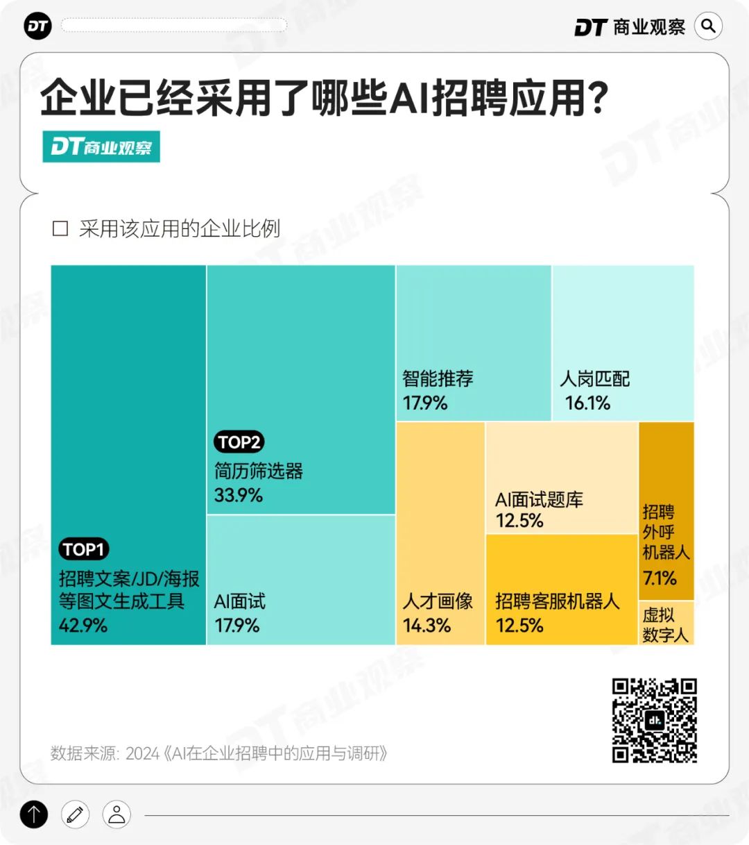 2024《AI在企業招聘中的應用與調研》數據顯示,42.9%的企業受訪者使用AI生成招聘文案/JD/海報等圖文,排名第一,33.9%的企業“簡歷篩選器”,排名第二。