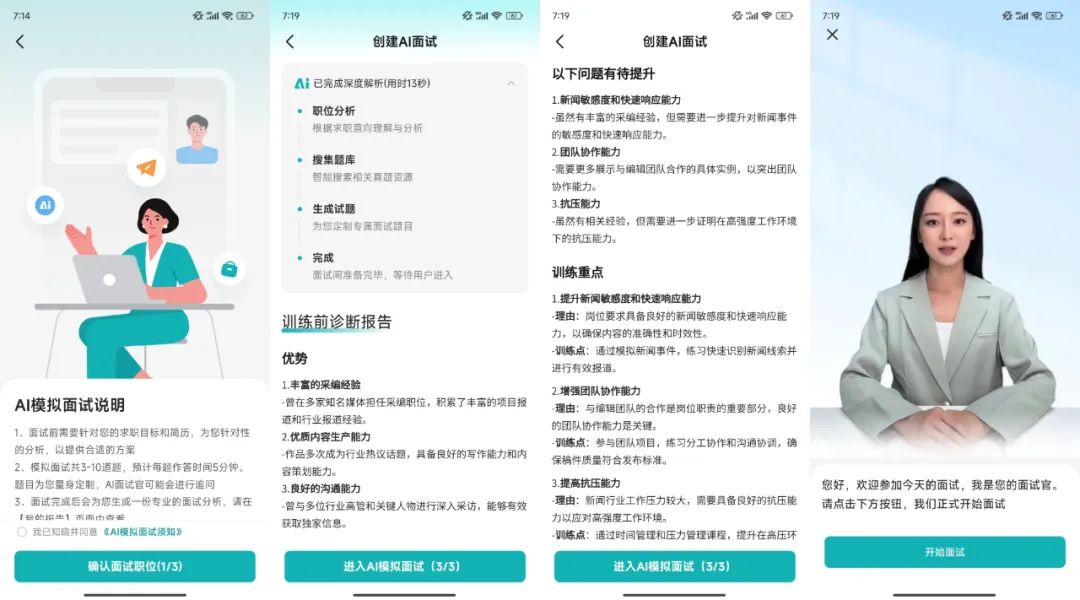 招聘平台們已經針對這樣的需求推出對應的AI功能。比如BOSS直聘正在灰度測試一個面向求職者的模擬面試功能。平台部署了一位“學習”過幾百萬次面試的機器人,可以幫助找工作的羣體進行面試訓練,並生成面試報告。面試問題是根據求職者的求職意向和簡歷專門定製的,面試報告也是“千人千面”。