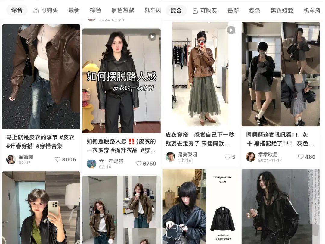 在小紅書皮衣熱門筆記中,“好搭配”、“鬆弛”、“隨性”是關鍵詞,除了經典的黑色、棕色皮革之外,焦糖色、棕紅色等色系也受到不少用户的喜愛。在款式和長度上,更是有超短款、短款、超長款、飛行式、巴恩風等五花八門的多樣選擇。