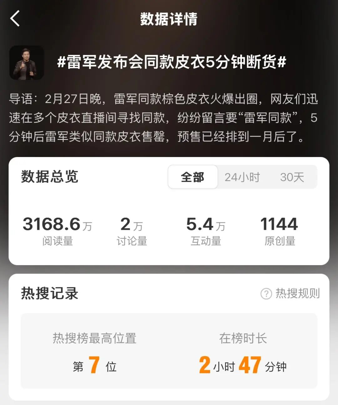 儘管“雷軍同款皮衣賣斷貨”的微博熱搜全網閲讀量已經超過3168.6萬,但對於像小澤這樣的中小體量商家而言,盲目跟風去賣皮衣並不是個好選擇。