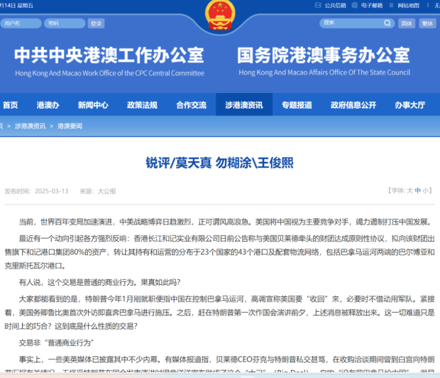 《大公報》發表了一篇“鋭評”,標題是《莫天真,勿糊塗》,作者為王俊熙,這篇評論剛剛被港澳辦,即中共中央港澳工作辦公室(國務院港澳事務辦公室)的官網給轉載了,這篇“鋭評”的特殊性在於,它直接點名評論了李嘉誠的香港長江和記實業有限公司與美國貝萊德集團牽頭的財團達成了原則性協議,即擬向該財團出售旗下和記港口集團80%的資產,轉讓其持有的和運營的分佈於23個國家的43個港口及配套物流網絡,包括最敏感的巴拿馬運河兩端的巴爾博亞和克里斯托瓦爾港口。