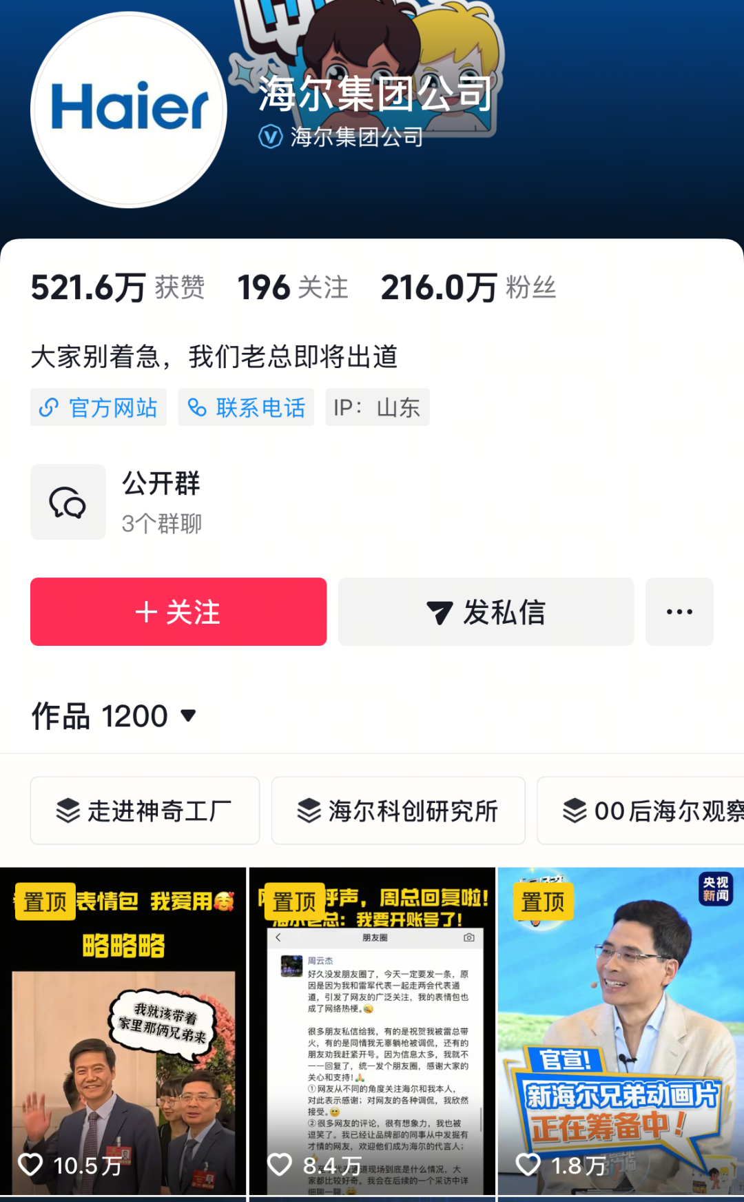 各大平台的海爾官方賬號也紛紛發文,比如官方微博立刻發佈了周雲傑視察工廠、與員工研討的九宮格照片;微信公眾號推出《你不知道的周總36事》長文;抖音賬號發佈海爾員工自制的“我為周總扛大旗”創意視頻,甚至直接把簡介改成了“大家彆着急,我們老總即將出道”,又帶了一波話題度。