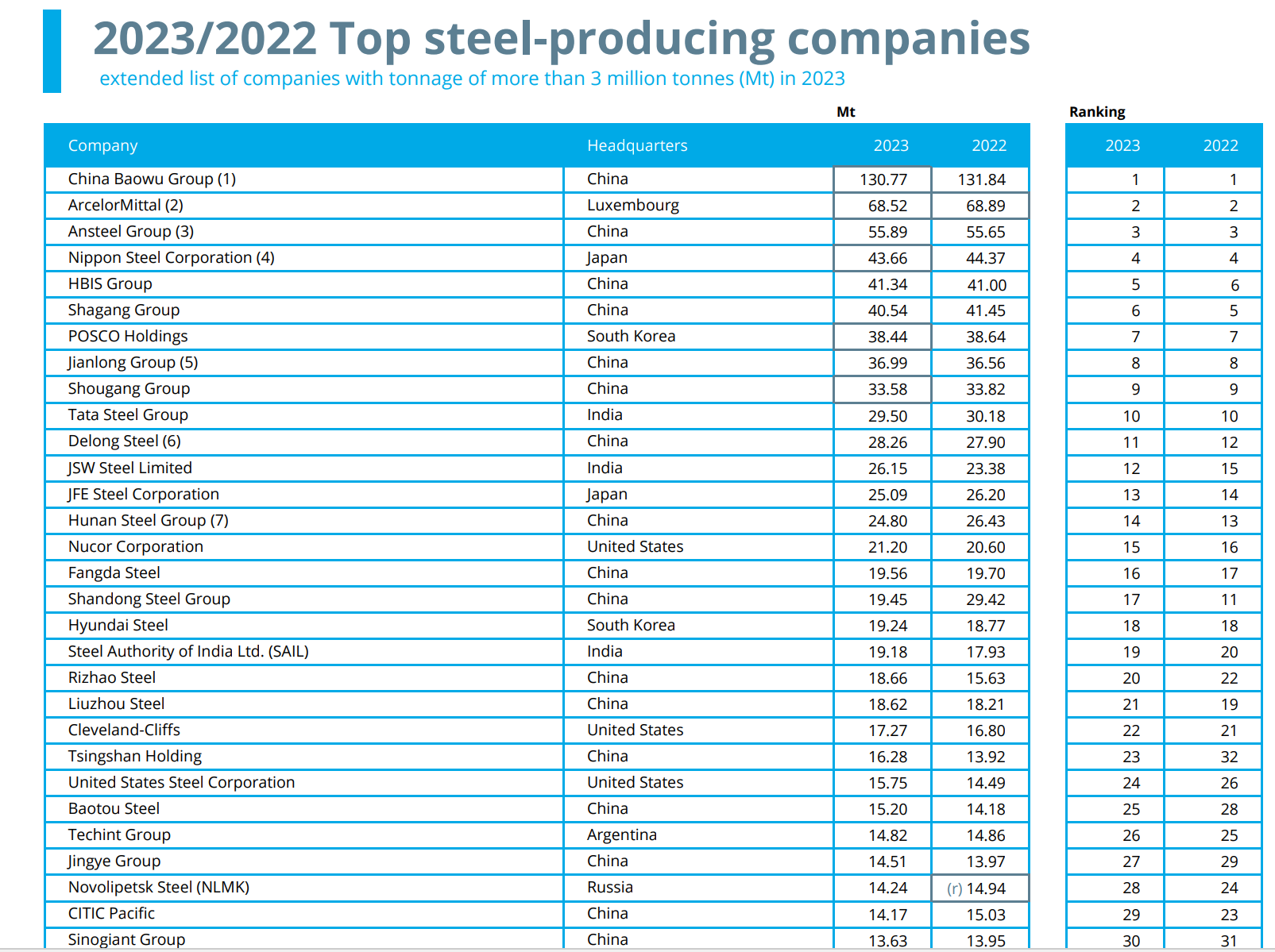 在2023年國際鋼鐵協會公佈的全球最大的100家鋼鐵生產企業中,印度有三家大型鋼鐵企業進入前三十,分別是塔塔鋼鐵(2950萬噸)、京德勒鋼鐵(2615萬噸)和印度鋼鐵管理局(1918萬噸)。