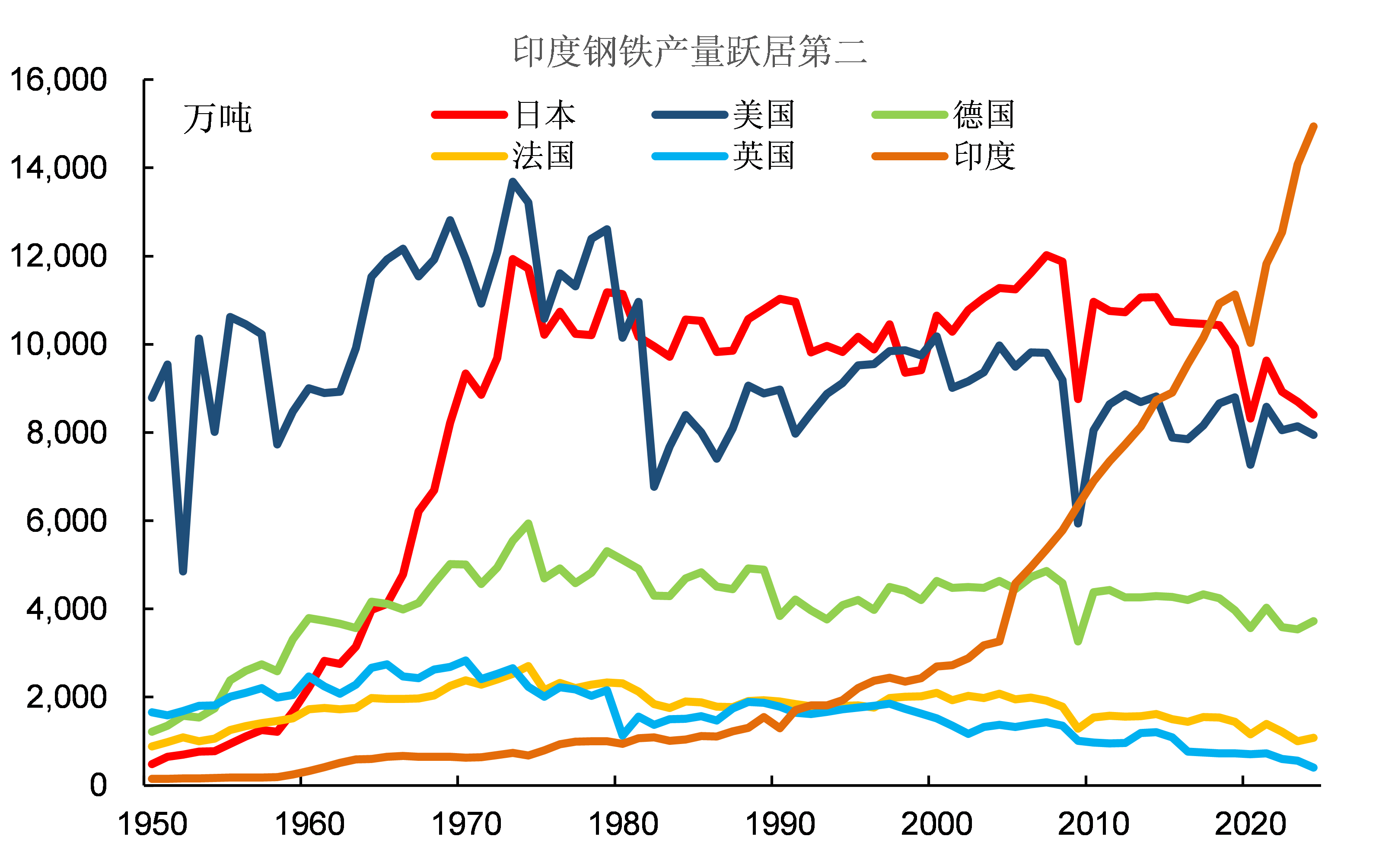 2024年,印度鋼產量達到1.49億噸,顯著超過鋼產量已經不到1億噸的美國和日本,更是大幅領先德國等老牌歐洲發達國家。