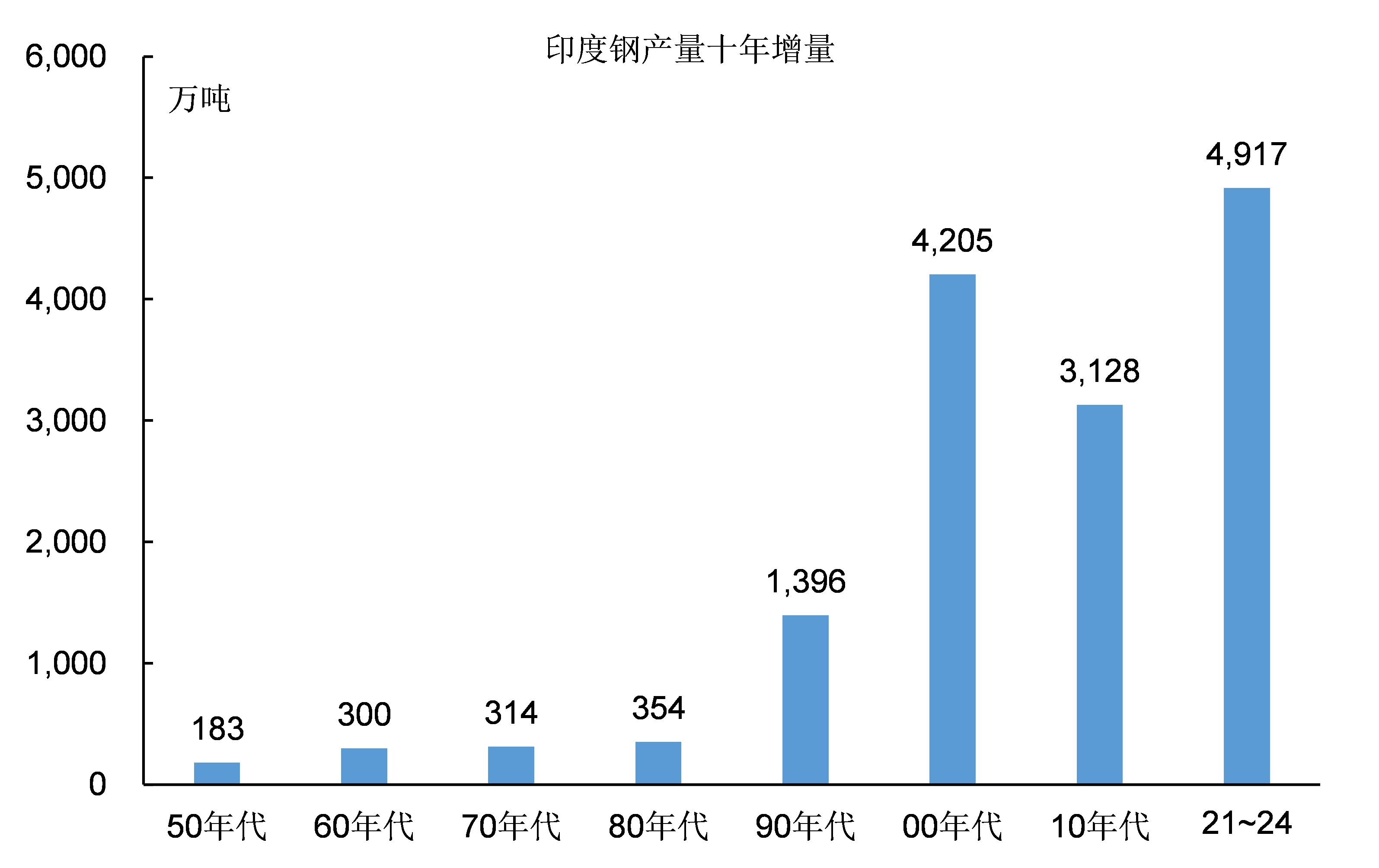 2000年後印度鋼鐵工業發展速度顯著加快,2010年鋼產量增長到0.69億噸,2020年增長到1.0億噸,2024年進一步增長至1.49億噸。