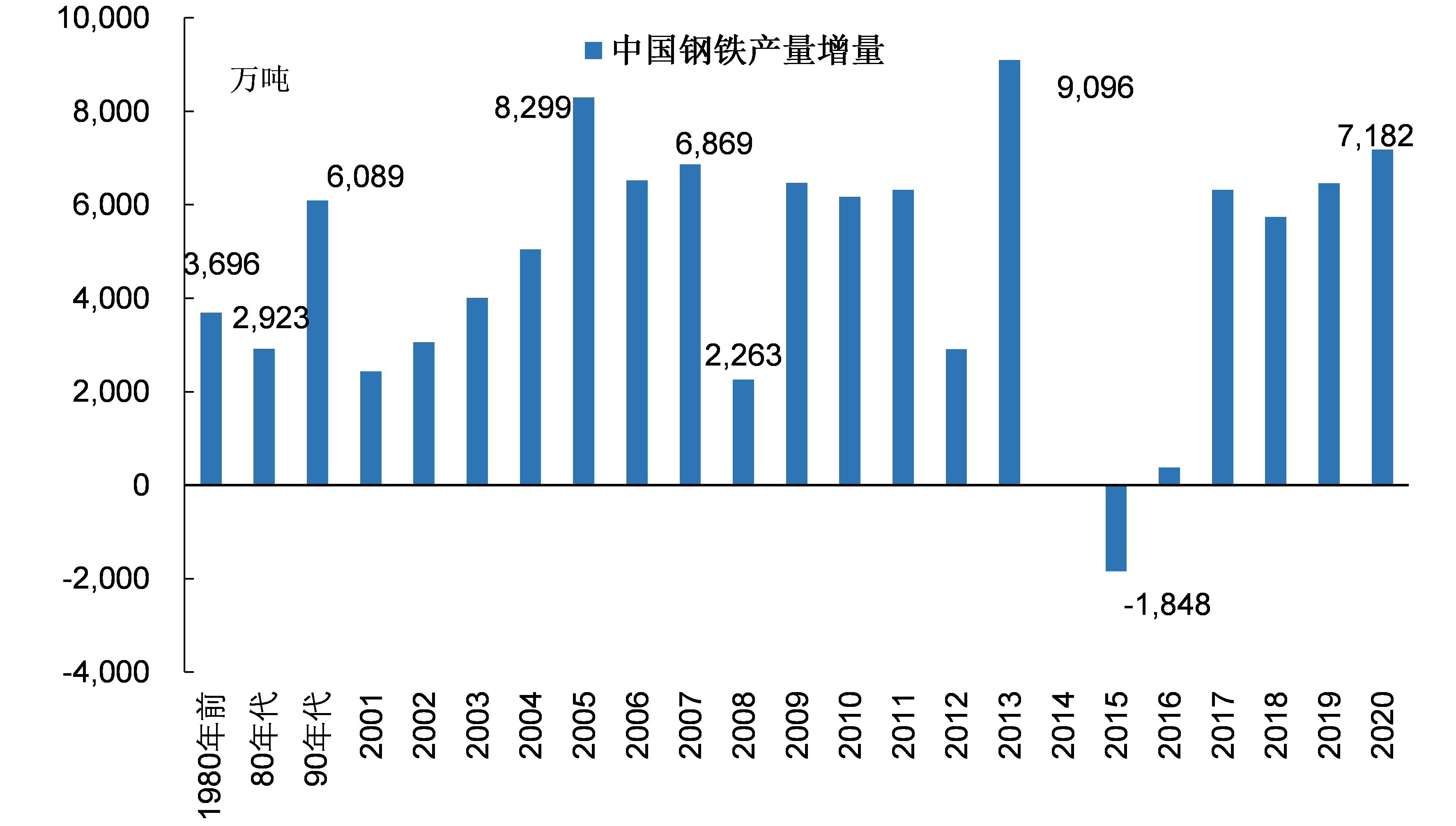 在90年代這十年間,中國鋼產量增加了6089萬噸;從2000年開始一直到2020年,中國在多數年份的鋼產量增量都在2000萬噸以上。