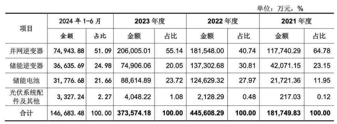 具體來看,2021年至2024年上半年,併網逆變器的營收分別為117740.29萬元、181548萬元、206005.01萬元、74943.88萬元;儲能逆變器的營收分別為42071.15萬元、137302.68萬元、74906.06萬元及36635.69萬元;儲能電池的營收為21721.36萬元、124629.32萬元、88614.89萬元及31776.68萬元。
