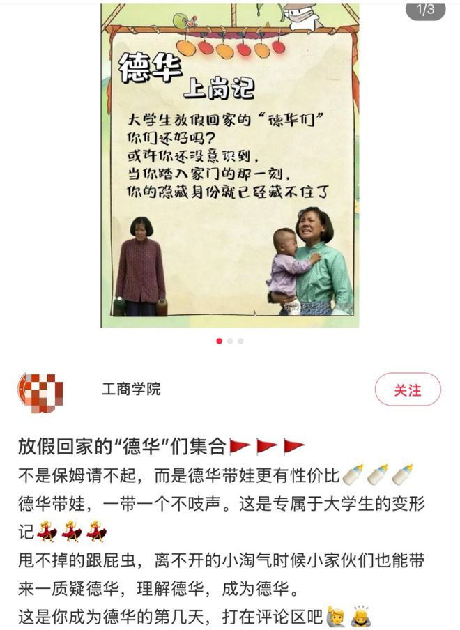 現在很多女大學生會在寒暑假裏短暫擔任“德華”的角色。隨着就業的不樂觀,全職小姑成為“全職兒女”的一條分支,變成另一個未婚女性可供短擇的備選方案。