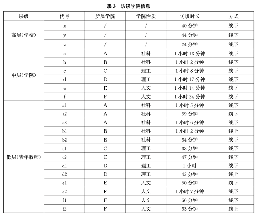 本文的數據來源分為兩部分:第一類是校方與各學院發佈的文件材料,我們對培訓方案的實施細則進行閲覽,據此選定了6個學院進行長期觀察,併為後期問卷調查和訪談大綱的形成奠定基礎。第二類來自為期10個月的參與式觀察及後續面向22位教學與管理人員的半結構化訪談:我們在規則實施階段向6個學院的青年教師發放了103份問卷,隨後與R校人事部和教師教學發展中心的3名領導(高層校領導)、來自6個學院的6名院長/副院長(中層院領導)和13名青年教師進行了半結構化訪談,詳見表3。