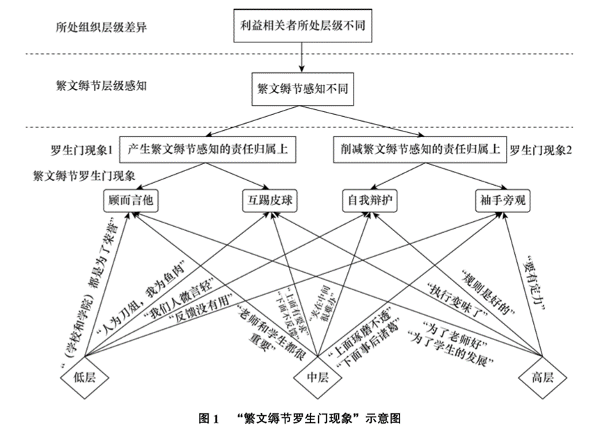 下文的案例表明,正是由於組織內的繁文縟節感知存在層級間差異,所以不同層級成員才會在產生繁文縟節的責任歸屬上,通過“顧而言他”來轉移話題,運用“互踢皮球”以推卸責任;也正是由於存在繁文縟節感知的層級間差異,所以不同層級才會在削減繁文縟節的責任歸屬上,採取“袖手旁觀”的行為,並就自己的不作為和失敗的努力展開“自我辯護”。這兩個表現被我們統稱為**“繁文縟節羅生門現象”**。據此,當各層級難以就誰應為造成和削減繁文縟節感知負責達成一致時,很難想象他(她)們會為剪除繁文縟節採取實質行動。